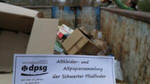 Zweimal jährlich sammeln wir in Schwerte Altkleider und Altpapier für die Unterhaltung unseres Pfadfinderheims. Die nächste Sammlung findet am Samstag, den 09. September 2023 statt. Wenn Sie uns mit Ihrer Altpapier- oder Altkleiderspende unterstützen möchten, bitten wir Sie, die mit einem Zettel markierten Altkleidersäcke und Altpapierbündel bis 09:00 Uhr…