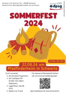 Am Samstag, 22. Juni 2024 findet das Sommerfest der Pfadfinder statt. Start: 14 Uhr Ende: 20 Uhr Ort: Pfadfinderheim Schwerte – Ernst Gremler Str. 1, 58239 Schwerte Es wird bis 18 Uhr ein buntes Programm geben: Spielestationen für die Kinder und ein Info Stand & Führungen durchs Pfadfinder…